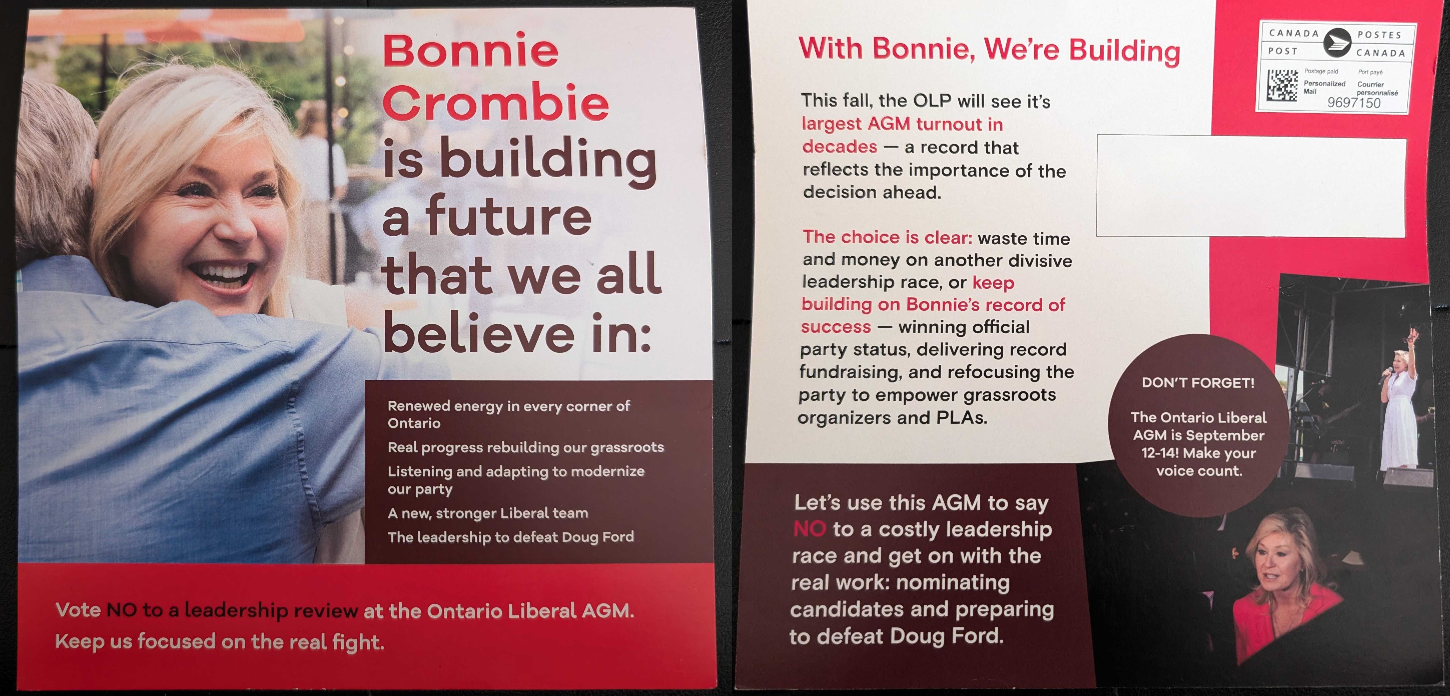 On the reverse, a Canada Post marking shows that this flyer is under their Personalized Mail rates, allowing targeting to specific addresses rather than blanketing a street like a normal advertisement. The back speaks more in Crombie’s favour, and then closes with “Let’s use this AGM to say NO to a costly leadership race and get on with the real work: nominating candidates and preparing to defeat Doug Ford.”
