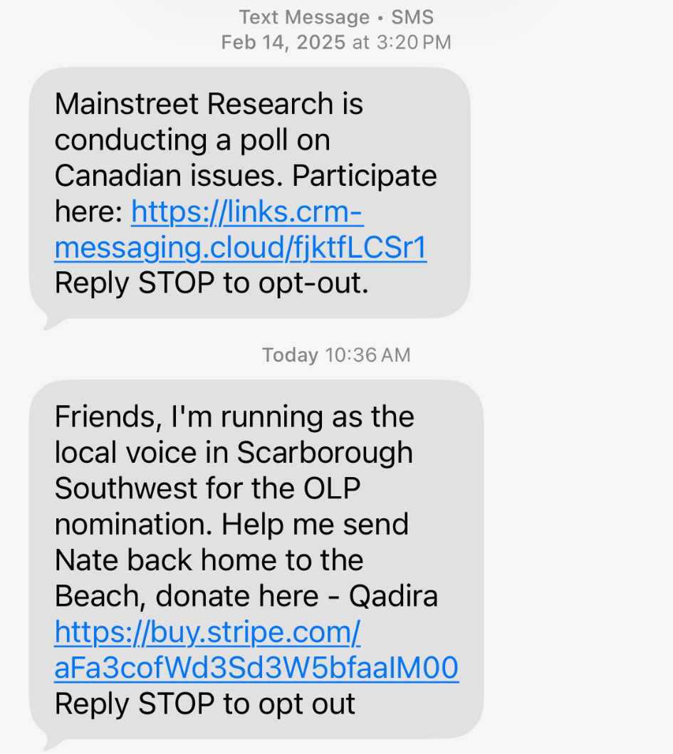What we know is that the phone numbers from which this text was received are rented out to various people. The header image demonstrates that a year prior to this text, Quito’s Mainstreet Research rented it for their own polling. Others have received contact from the same number for Liberal campaigns, including Chrystia Freeland’s Federal Liberal leadership run.